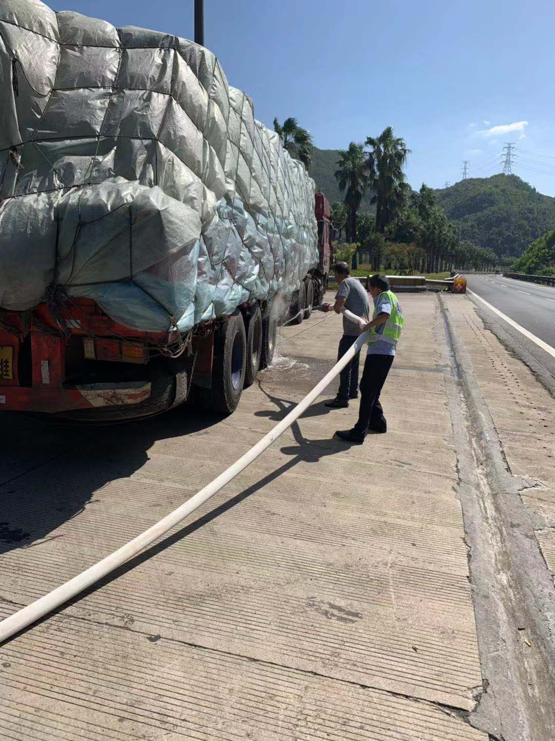 圖為消滅隱患現(xiàn)場 同時,中控員密切關(guān)注車輛動向,13:37,中控員在隧道南廣場發(fā)現(xiàn)該車,巡邏車立即奔赴現(xiàn)場,該車后輪胎剎車位置在冒煙,司機正用礦泉水澆輪胎,隊員們見狀,火速上前把消防栓打開,接上消防水帶,交與該車司機,托著消防水帶,對準輪胎接連猛射,冷卻剎車片,輪胎終于沒有冒煙,一場隱患被隊員消除了。 據(jù)悉,該輛半掛車因輪胎爆炸,引起冒煙,司機卻想著從下一個高速出口,幸好隊員們監(jiān)控及時,出警迅速,施救到位,把隱患扼殺在搖籃里,沒在隧道內(nèi)發(fā)生火災,不然后果將無法想象。 現(xiàn)場,隊長告知司機,萬一車輛發(fā)生火災,請把車停在隧道外,若在隧道內(nèi)發(fā)現(xiàn)車輛起火,請加速駛往隧道口,盡快駛離隧道,避免造成人員傷亡。 陳智慧