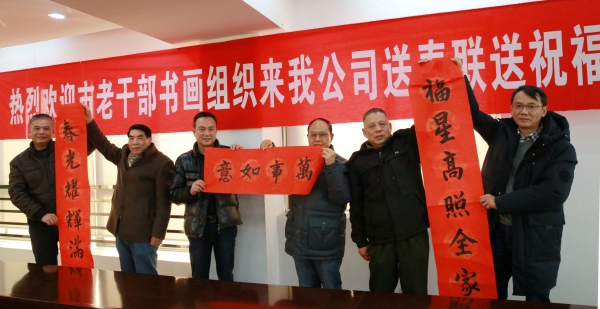 市老年書(shū)畫(huà)研究會(huì)會(huì)長(zhǎng)楊通河一行來(lái)公司送春聯(lián)送祝福 1月17日下午,市老年書(shū)畫(huà)研究會(huì)會(huì)長(zhǎng)楊通河,市直機(jī)關(guān)老干部書(shū)畫(huà)協(xié)會(huì)領(lǐng)導(dǎo)施巨日、陳孔梅一行來(lái)公司送春聯(lián)送祝福,感謝公司對(duì)研究會(huì)的支持和關(guān)愛(ài),祝愿公司在新的一年里紅紅火火,萬(wàn)事如意,經(jīng)營(yíng)發(fā)展越來(lái)越好。