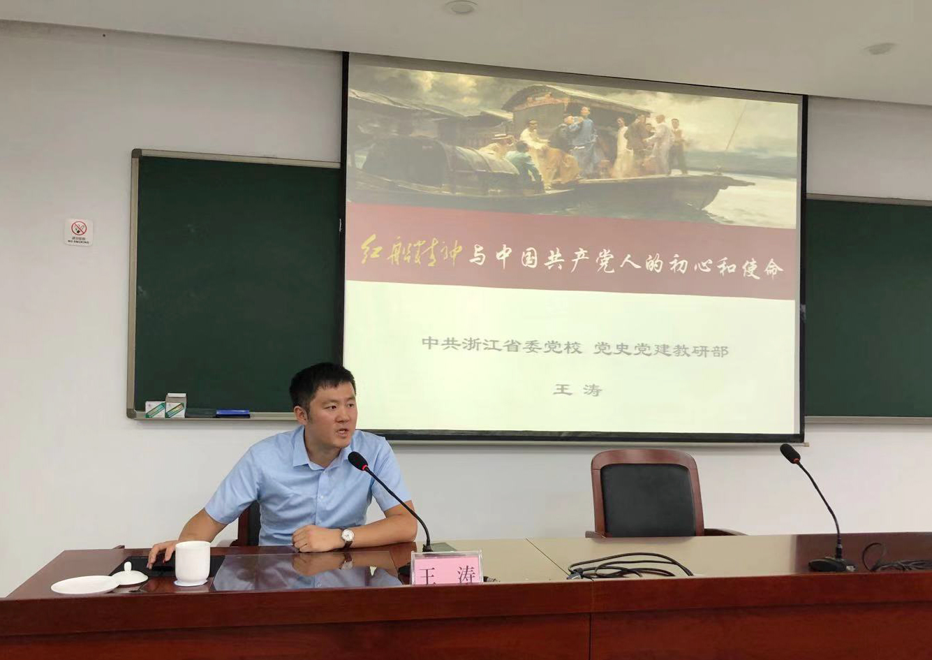 圖為省委黨校黨史黨建教研部博士王濤 以《弘揚(yáng)紅船精神 不忘初心使命 》為題授課