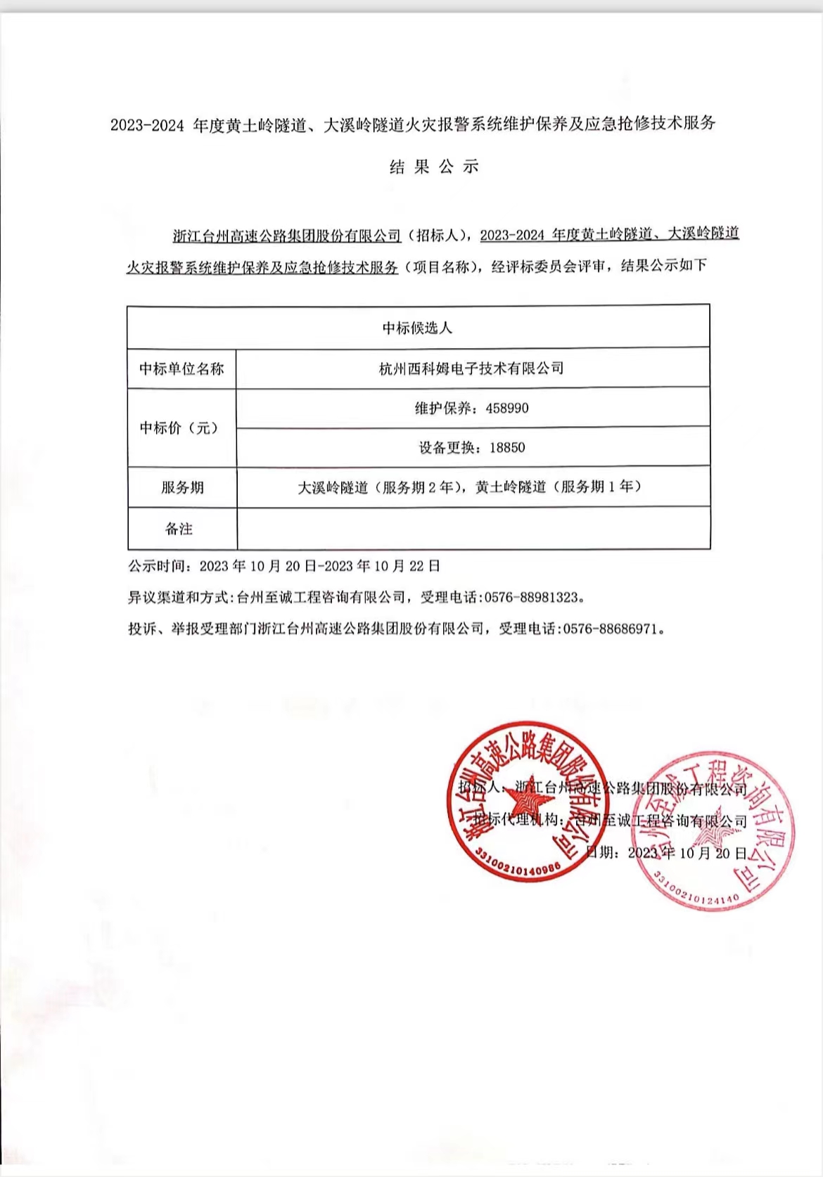 2023-2024年度黃土嶺隧道、大溪嶺隧道火警報警系統(tǒng)維修保養(yǎng)及應(yīng)急搶修技術(shù)服務(wù)結(jié)果公式