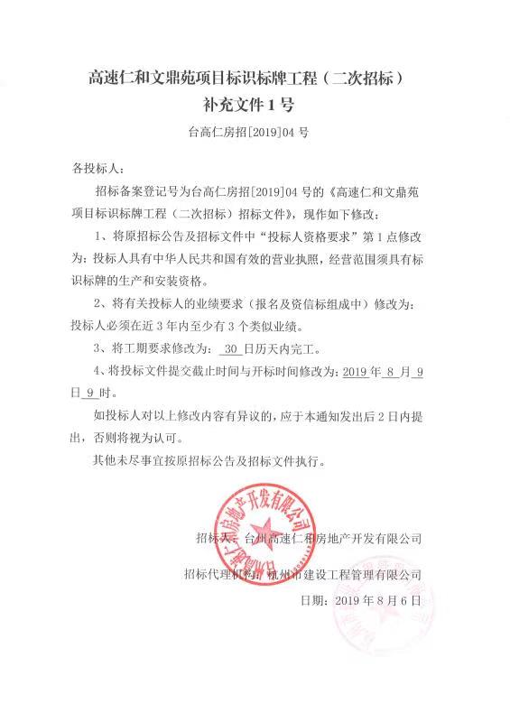 高速仁和文鼎苑項(xiàng)目標(biāo)識(shí)標(biāo)牌工程(二次招標(biāo))補(bǔ)充文件1號(hào)