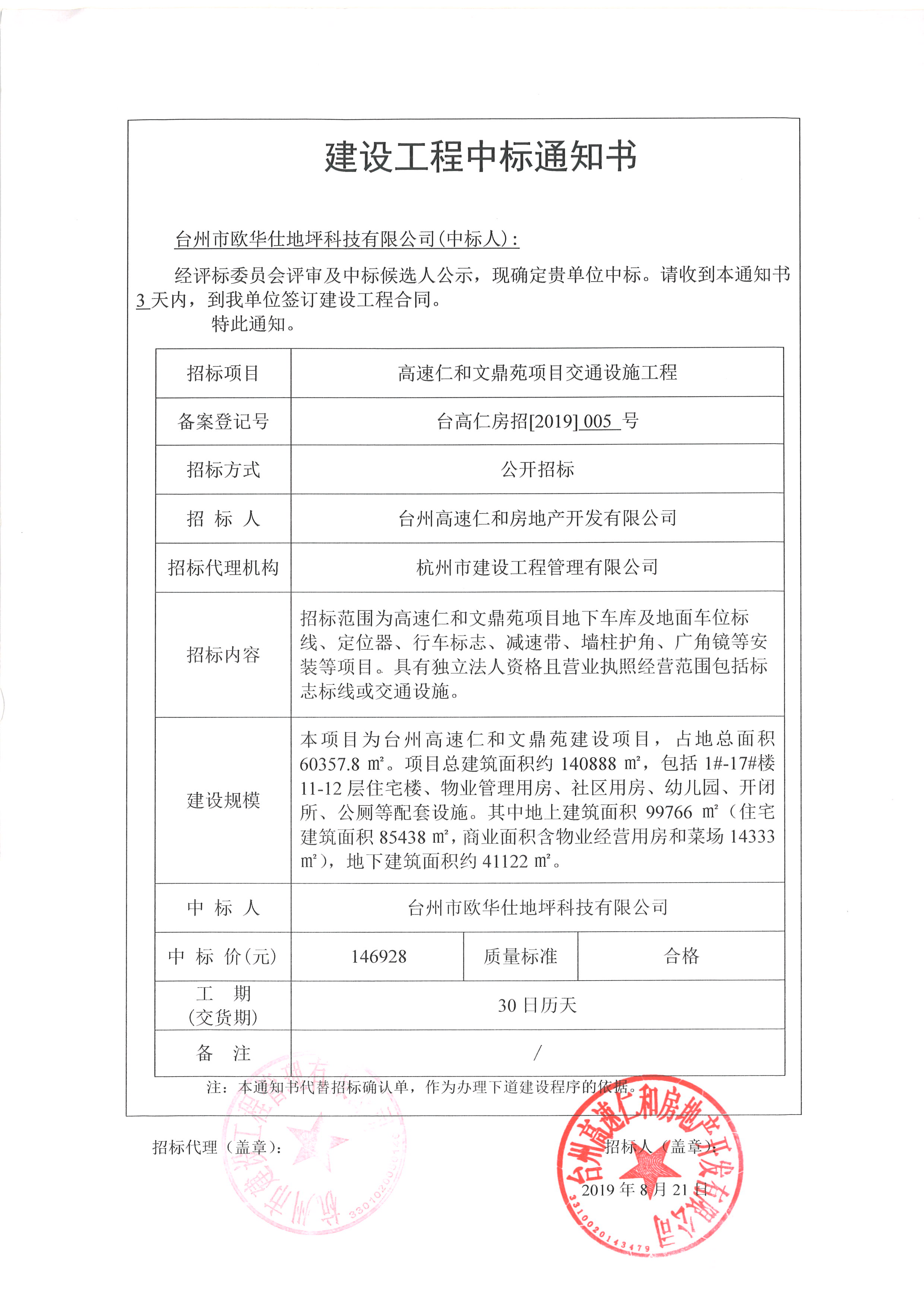 高速仁和文鼎苑項(xiàng)目交通設(shè)施工程中標(biāo)通知書