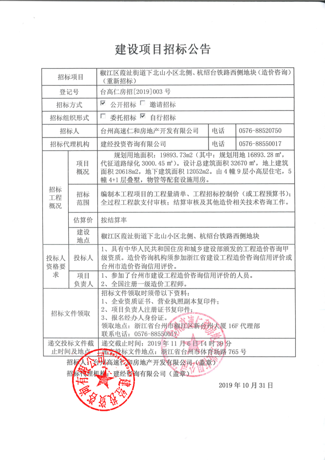 椒江區(qū)葭沚街道下北山小區(qū)北側(cè)、杭紹臺(tái)鐵路西側(cè)地塊(造價(jià)咨詢)招標(biāo)