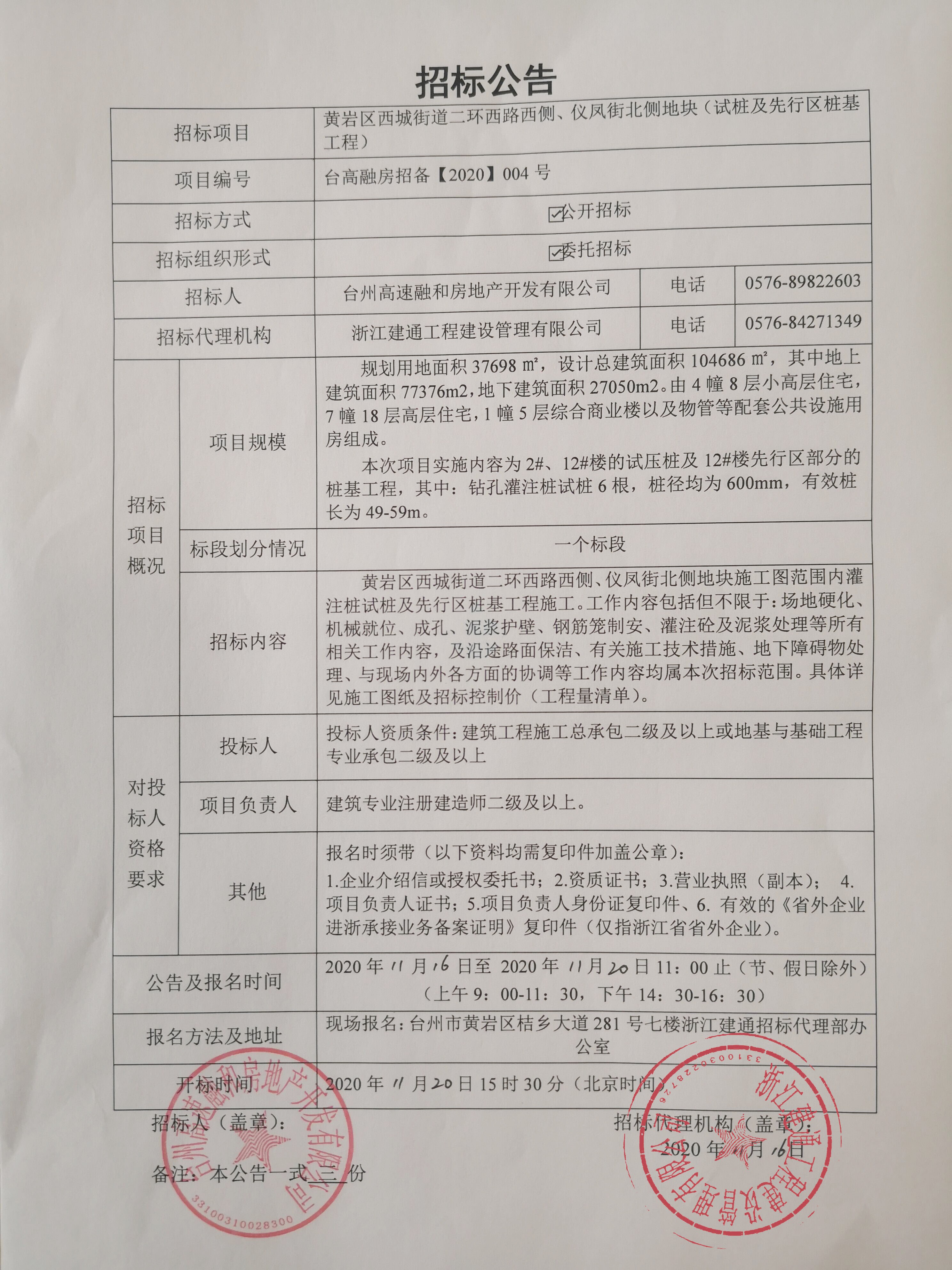 黃巖區(qū)西城街道二環(huán)西路西側(cè)、儀鳳街北側(cè)地塊(試樁及先行區(qū)樁基工程)招標公告