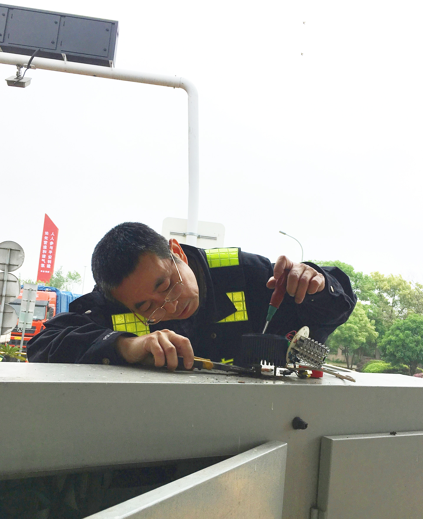 歲月滄桑,時光荏苒,如今張鵬兩鬢已顯斑白,眼睛也有些老花,但依然精神抖擻,干勁十足。8月12日,臺風過后的臺州南收費所內廣場有兩盞路燈同時失效。當?shù)歉哕囘^來的時候,盡管當時他因痛風雙腳腫大還沒完全消退,但仍第一個跳上去維修,站在狹小車兜里佝僂著身子,戴著老花鏡更換各種設備。8月的烈日炎炎似火燒,沒過一會豆大的汗珠從他額頭上淌下透濕了全身。